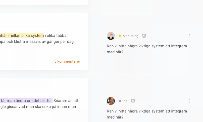 Under tiden som frågan är igång och svaren börjar rassla in kan du använda dig av markeringsverktyget för att lyfta fram det som är viktigt, intressant eller kanske nya idéer som poppar upp i diskussionen. Markeringarna syns bara för dig som administratör och följer med i rapporten.