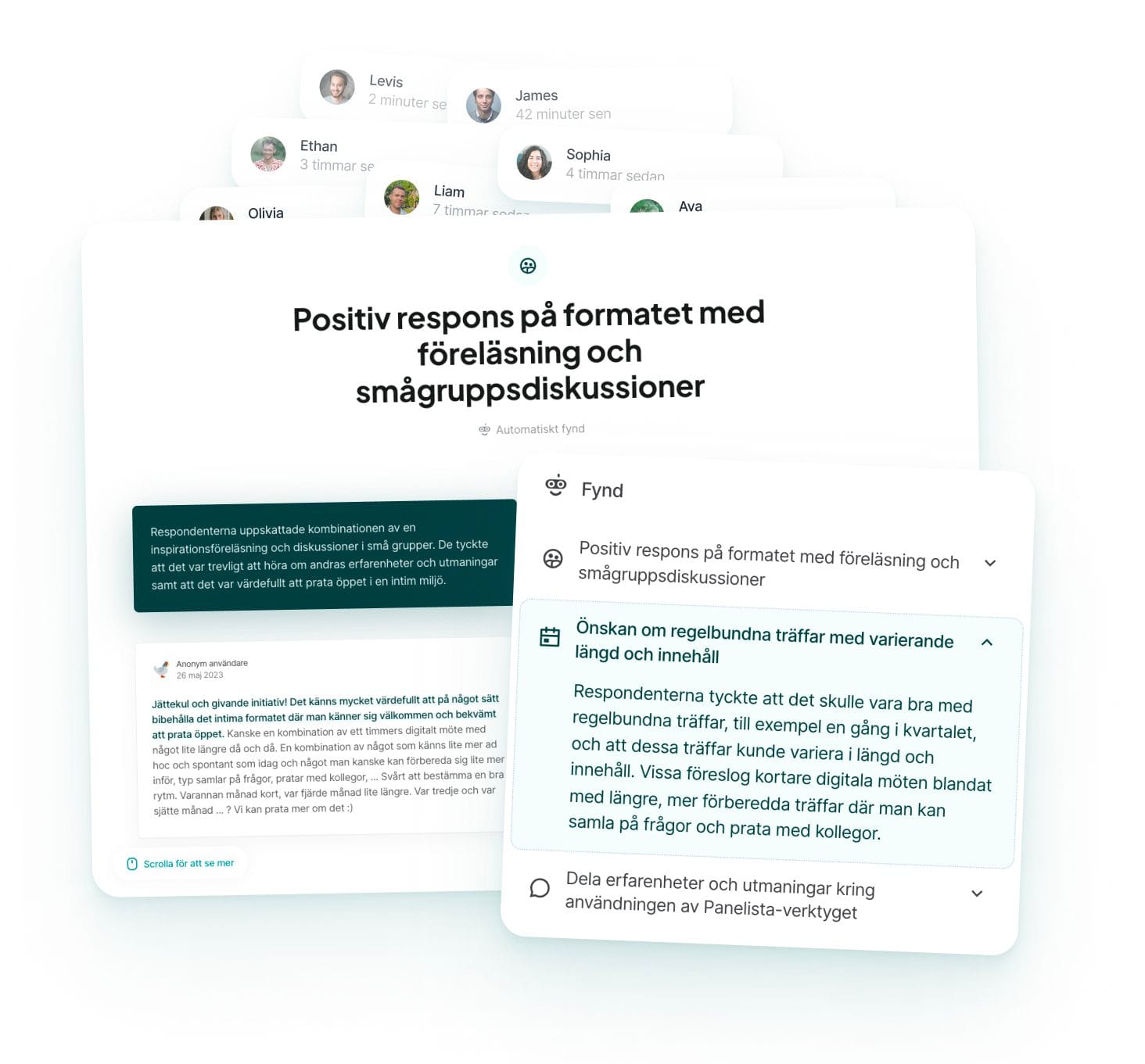 Bredvid svarsflödet för både touchpoints och panelfrågor hittar du en grå liten figur. Det är vår AI och arbetar i bakgrunden med att läsa och analysera feedbacken, sammanfatta den och upptäcka intressanta fynd. Du kan se den som ett hjälpmedel för att hitta mönster eller fynd som du själv kanske inte har hunnit upptäcka.